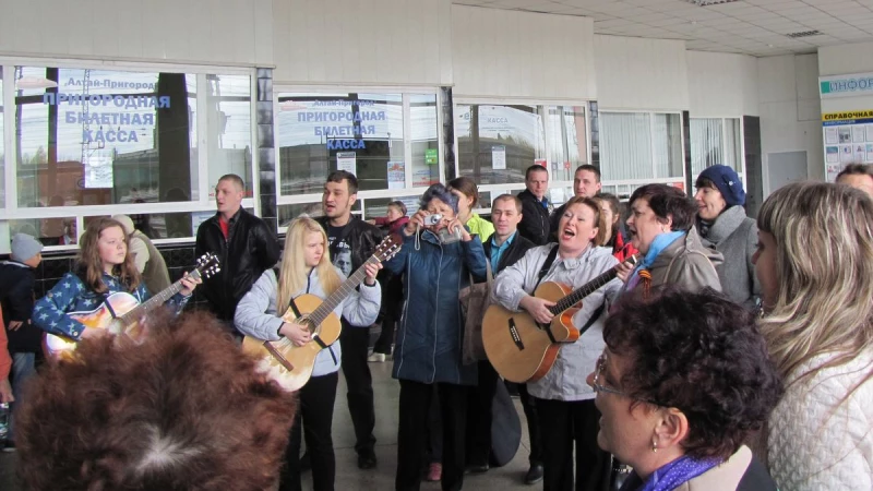 Инициаторы мероприятия – женсовет, совет молодежи и вокальная группа ветеранов "Алтай-Кокса". К ним присоединились участники клуба самодеятельной песни и клуба "Менестрель" центра детского творчества. Идею с удовольствием поддержало руководство заринского железнодорожного вокзала, где и проходил флэш-моб.