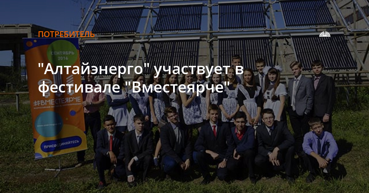 Он проходит во всех крупных городах страны по инициативе Минэнерго России и Федерального агентства по делам молодежи. Цель – популяризация темы энергосбережения и повышения энергетической эффективности среди населения. "Алтайэнерго", как крупнейшая электросетевая компания региона, поддерживает популяризацию темы энергосбережения и поэтому является одним из участников фестиваля #ВместеЯрче.