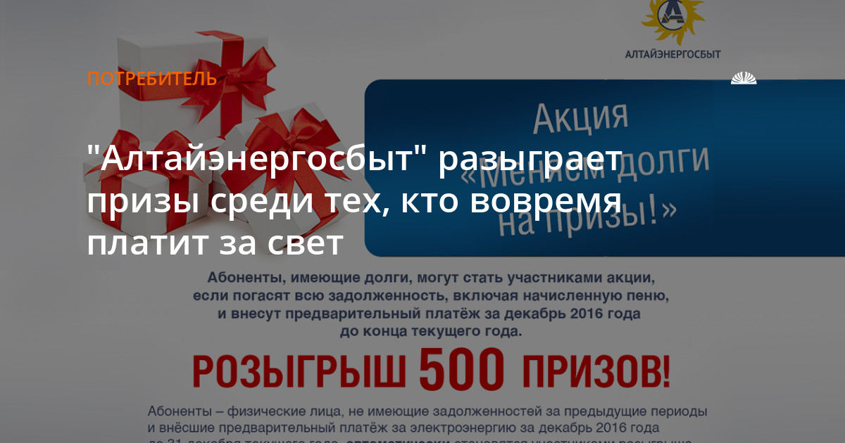 Организатор акции: АО "Алтайэнергосбыт". Данная акция не распространяется на сотрудников АО "Алтайэнергосбыт". Призы при розыгрыше будут распределены следующим образом: Республика Алтай: 6 предметов бытовой техники, 4 набора светодиодных ламп, 90 дисконтных карт со скидкой от 10 до 20% на электротехническую продукцию, реализуемую АО "Алтайэнергосбыт"; Алтайский край: 18 предметов бытовой техники, 12 наборов светодиодных ламп, 370 дисконтных карт со скидкой от 10 до 20% на электротехническую продукцию, реализуемую АО "Алтайэнергосбыт". Дисконтные карты используются однократно и до 31.12.2017г. После осуществления покупки карты остаются в клиентских офисах АО "Алтайэнергосбыт". Розыгрыш будет проводиться путём использования интернет - генератора случайных цифр. Он сгенерирует порядковые номера, присвоенные лицевым счетам абонентов АО "Алтайэнергосбыт", выполнивших условия акции. Розыгрыш состоится до 28.02.2017. Его результаты будут опубликованы на сайте АО "Алтайэнергосбыт". Публикации подлежат только номера лицевых счетов абонентов - победителей акции. Выдача призов будет осуществляться в клиентских офисах АО "Алтайэнергосбыт" на территории обслуживания абонентов – победителей акции после публикации результатов розыгрыша и до 30.03.2017. Подробная информация об организаторе и условиях акции – на сайте АО "Алтайэнергосбыт".