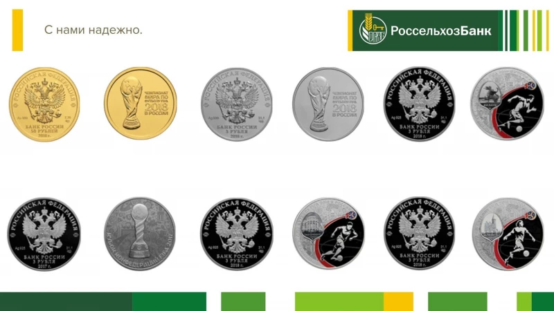 В продаже имеются инвестиционные монеты из золота и серебра номиналом 50 и 3 рубля, а также памятные серебряные монеты номиналом 3 рубля, посвященные городам в которых будут проходить матчи чемпионата: Екатеринбургу, Казани и Калининграду. Монета "Футбол 2018" имеет вес 7,78 грамма и изготовлена из золота 999 пробы. Вес аналогичной серебряной монеты составляет 31,1 грамма. Стоимость монет составляет: 1950 рублей за серебряную монету, 19900 рублей за золотую.*