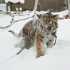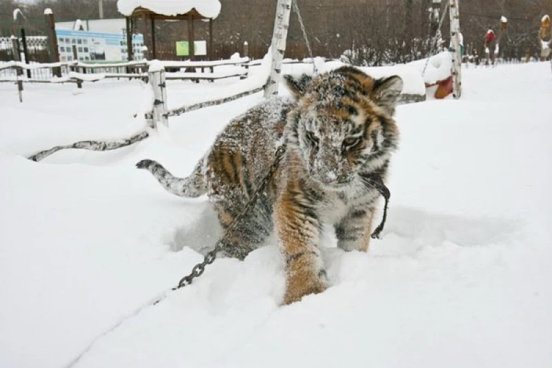 Багире нравится прогуливаться по территории зоопарка. Конечно, на крепком поводке из цепных звеньев. Попрыгав и навалявшись в сугробах, внимание тигрицы привлекли кролики. Багира кинулась к вольерам с длинноухими и со всего маху бахнулась на спину. Охота не удалась. А потенциальная добыча находилась за сеткой из проволоки и радостно шевелила ушами.