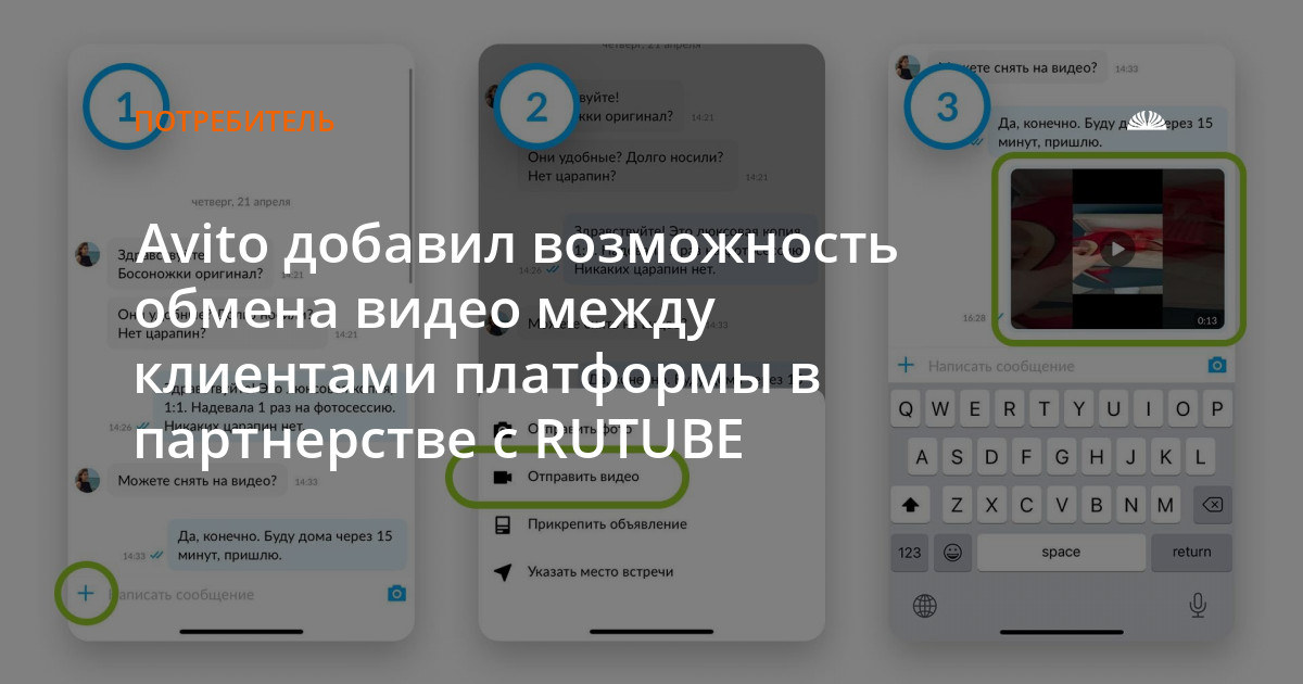 RUTUBE предоставляет API для загрузки видео и iframe для его воспроизведения. Для пользователей все устроено максимально просто: нужно зайти в мессенджер Авито, выбрать полный список опций через значок в виде плюса и затем нажать «Отправить видео». Видео MP4, AVI, WMV, MOV, FLV и других популярных форматов хронометражем до пяти минут загружаются прямо из памяти телефона пользователя.