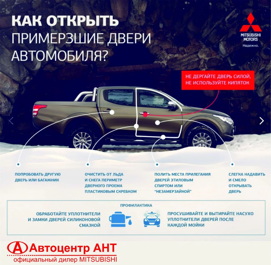 Обработайте уплотнительные резинки жидким силиконом или смажьте их тосолом. Тогда они не будут примерзать на морозе. Смажьте WD-40 все замки. Повторяйте процедуру после каждой мойки.