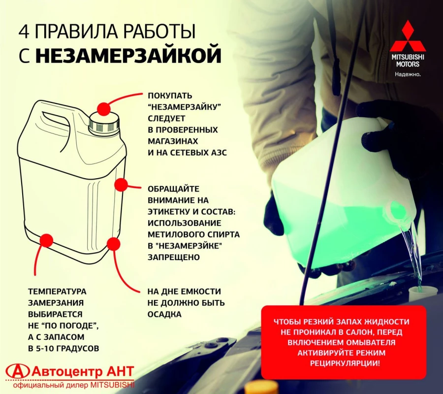 Все жидкости и масла в автомобиле также требуют оценки. Возможно, понадобится заменить или долить масло. Помните, что эксплуатация неподготовленного к зиме автомобиля опасна и может привести к аварии! Также особое внимание необходимо уделить системе охлаждения. До наступления морозов важно убедиться в том, что в радиаторе, а также во всей системе отсутствует вода. Так как замерзшая жидкость может спровоцировать разрыв патрубков и привести к другим более серьезным проблемам. В систему охлаждения заливается специальная жидкость – антифриз. Охлаждающую жидкость следует выбирать, ориентируясь на технические характеристики транспортного средства. Автоцентр АНТ рекомендует использовать оригинальный антифриз Super Long Life бренда Mitsubishi. Независимо от выбранного типа и марки производителя, важно помнить, что смешение разных антифризов крайне нежелательно. Эксперименты такого рода могут спровоцировать серьезные поломки: система отопления "забивается" и в последствии двигатель перегревается и выходит из строя.
