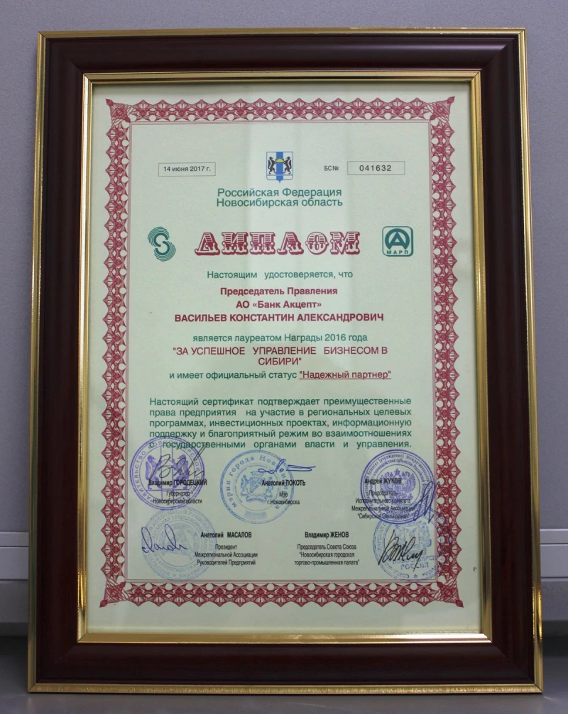 Председатель правления АО "Банк Акцепт" Константин Васильев награжден дипломом "За успешное управление бизнесом в Сибири".