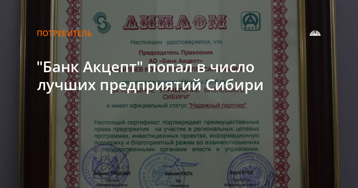 Среди самых успешных предприятий Новосибирской области АО "Банк Акцепт". Банк стал лауреатом конкурса, подтвердил статус "Надежный партнер" и преимущественные права на участие в региональных целевых программах и инвестиционных проектах.