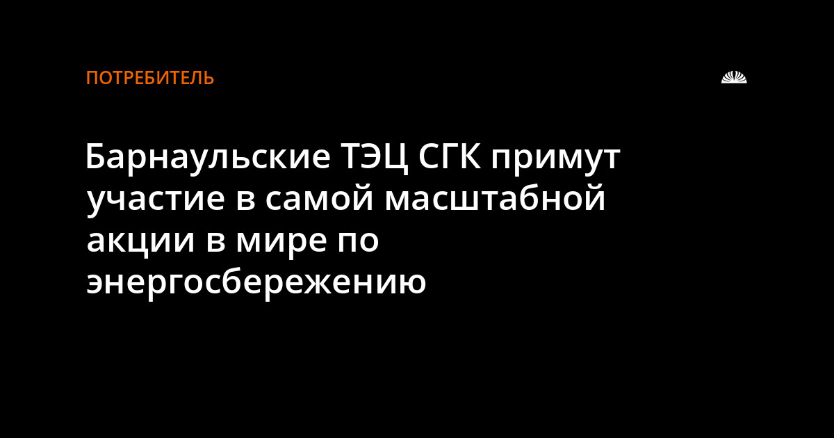 С 20.30 до 21.30 часов на станциях СГК в Барнауле будут отключены подсветка стел и ограждений на прилегающей территории, вывесок на главных зданиях и значительная часть наружного освещения ТЭЦ.
