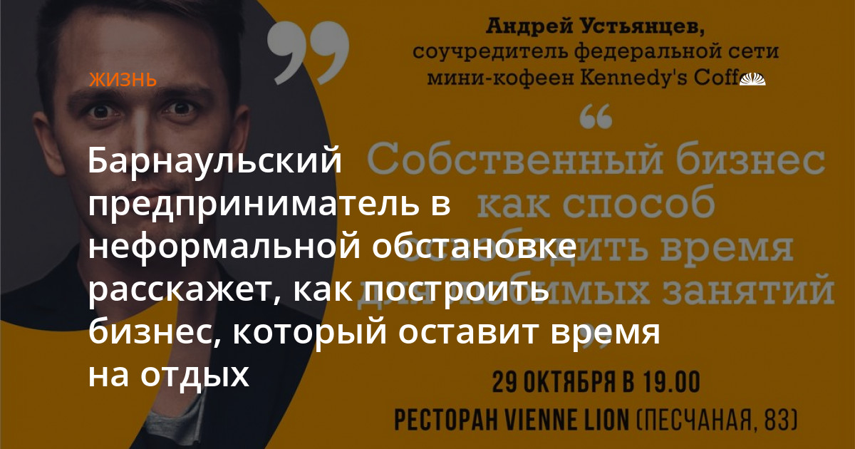 Первым спикером проекта станет соучредитель федеральной сети мини-кофеен Kennedy's Coffee Андрей Устьянцев. Андрей расскажет, как собственный бизнес помог ему освободить время для любимых занятий.