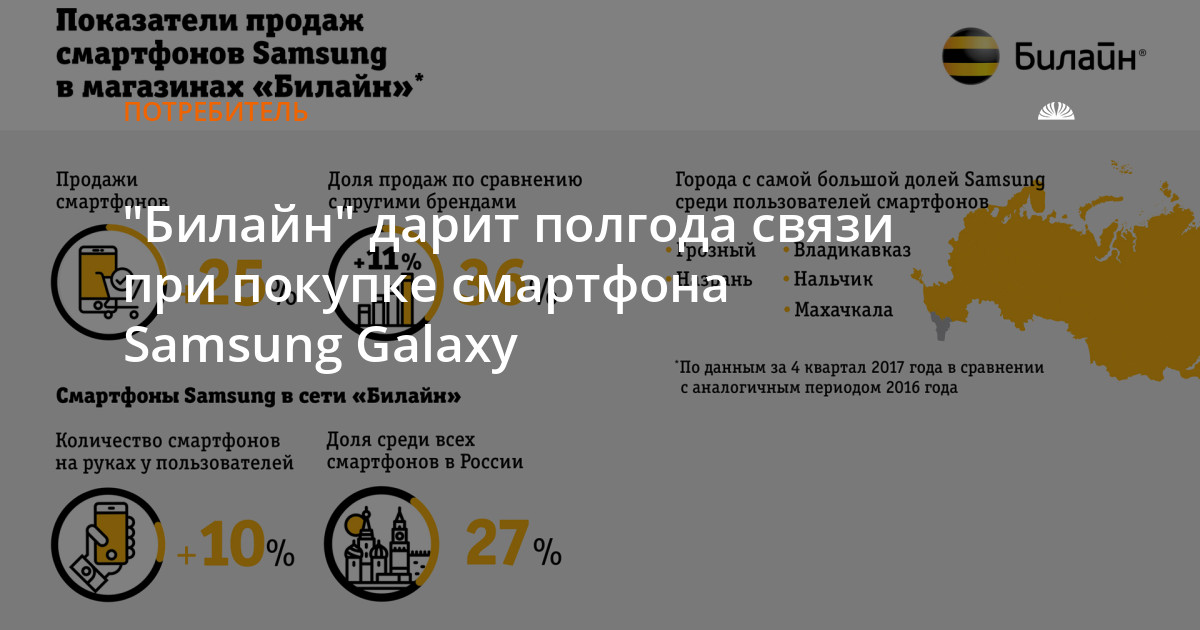 С 7 февраля по 31 марта 2018 года в офисах продаж и интернет-магазине "Билайн"* при покупке Samsung Galaxy "Билайн" дарит от трех до шести месяцев связи на тарифных планах "Всё2" и "Всё3" в зависимости от модели смартфона.**