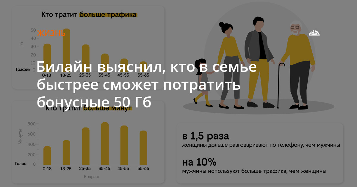 Разницу в использовании интернета и голосовой связи в семье можно скомпенсировать двумя способами. Для того, чтобы получить дополнительный пакет интернета, можно воспользоваться акцией «Семейный бонусный пакет 50 ГБ». Для этого достаточно оформить новую SIM-карту билайн и до 20 августа 2022 года подключить близких к своему тарифу с помощью платной услуги «Дели ВСЁ». Пакет 50 ГБ будет предоставлен вне зависимости от количества подключенных дополнительных номеров.