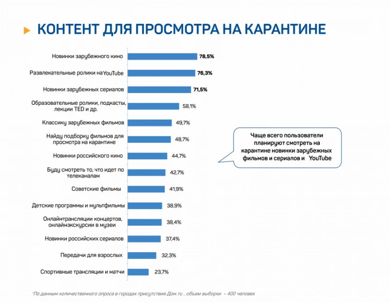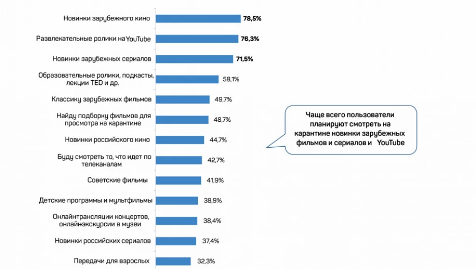 В лидерах по запросу контента находятся новинки зарубежного кино – 78,5%, YouTube – 76,3%, образовательные ролики, подкасты и лекции – 58,1%.