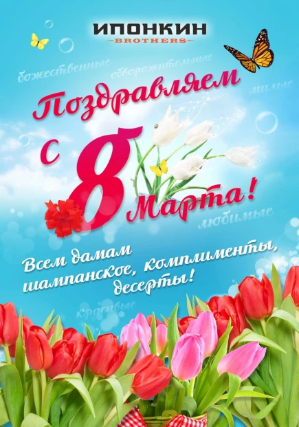 8 марта в ресторане Ипонкин особая праздничная атмосфера, всем дамам ресторан подарит шампанское, угощения и много комплиментов.