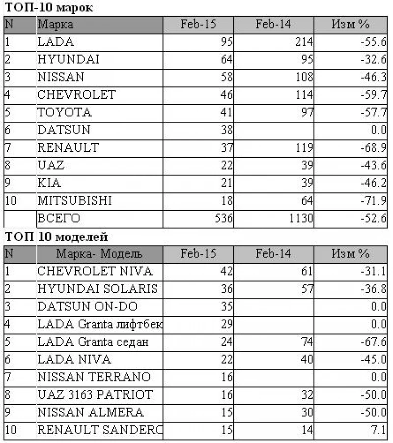 Из десятки самых популярных брендов падение продемонстрировали все, за исключением Datsun, который год назад попросту еще не продавался. Диапазон регресса продаж составляет от 32% у Hyundai до 72% у Mitsibishi. Впрочем, как объяснила на днях auto.altapress.ru Ольга Частухина, директор по развитию автоцентра "Реал", реальное падение продаж у алтайских дилеров составляет около 20% - в статистику не входят автомобили, которые после покупки отправились в Казахстан.