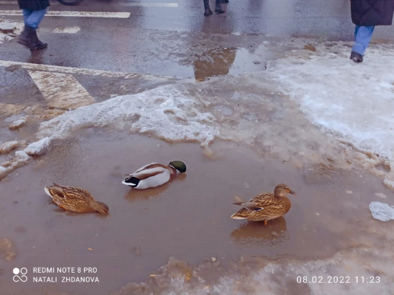 Причем воды на улицах порой так много, что в лужах из растаявшего снега плавают утки - прямо возле станции метро.