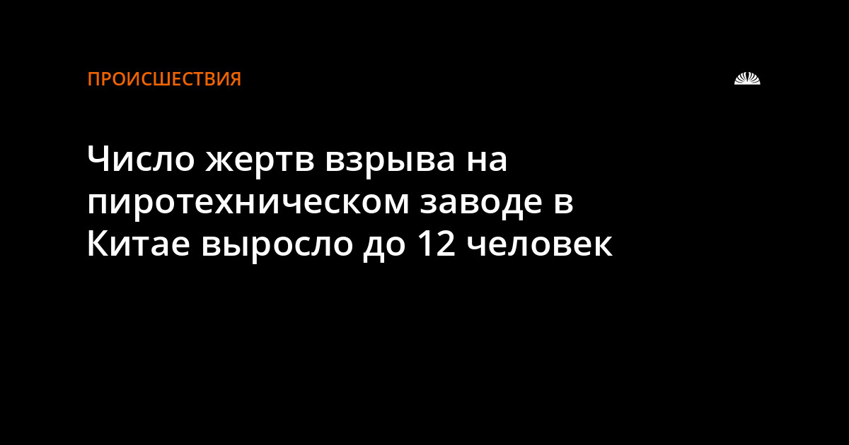 Число жертв взрыва на одном из пиротехнических заводов города Лилин провинции Хунань (Центральный Китай) возросло до 12 человек. Кроме этого, 33 человека получили травмы, двое оказались отрезаны от связи.
