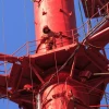 Пока мы беседовали с руководителями, Александр, рабочий, спустился ниже к земле. За полчаса он успел покрасить примерно 10 метров телемачты и стал еще сильнее похож на Человека-паука. Подстрахованный тросом, мужчина перемещался по «трубе» вправо-влево, а из-за его алой от пятен спины жужжал пульверизатор.
