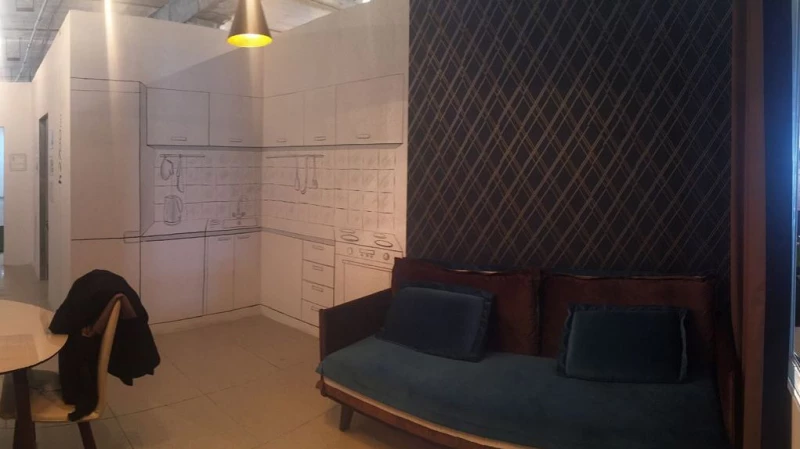 Модель однокомнатной квартиры создана площадью 33 кв. м, лоджия – 2,6 кв. м. Здесь есть комната с выделенной гардеробной, кухня-гостиная, санузел. В помещении можно посидеть за столом под модными абажурами и рассмотреть дизайн будущего жилья.