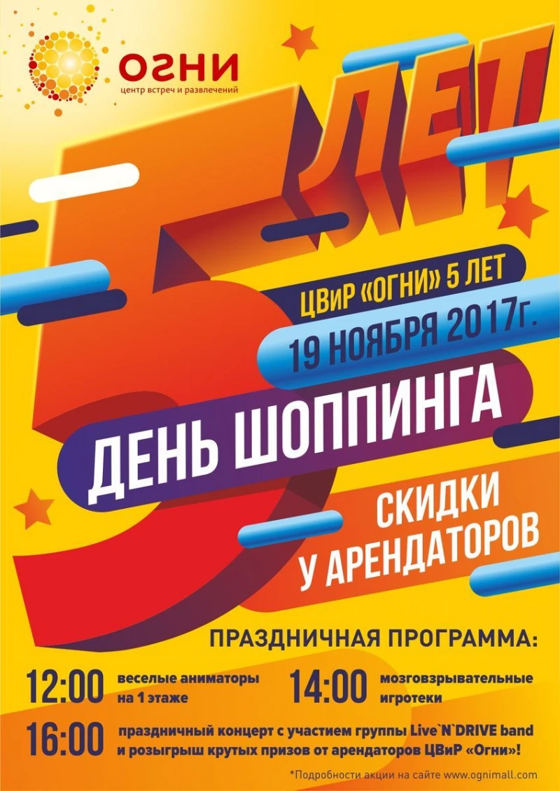 *Организатор акции: Центр Встреч и Развлечений "Огни". Дата проведения акции 19 ноября 2017 года. Подробности акции и список скидок от арендаторов вы можете посмотреть на сайте www.ognimall.ru