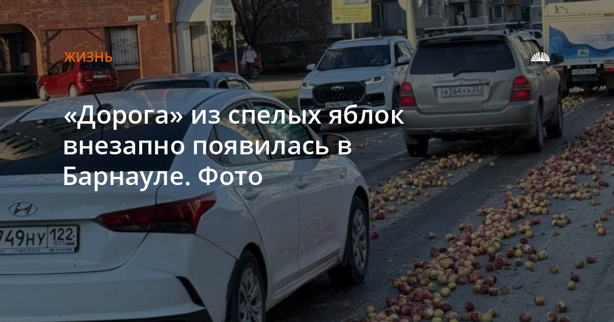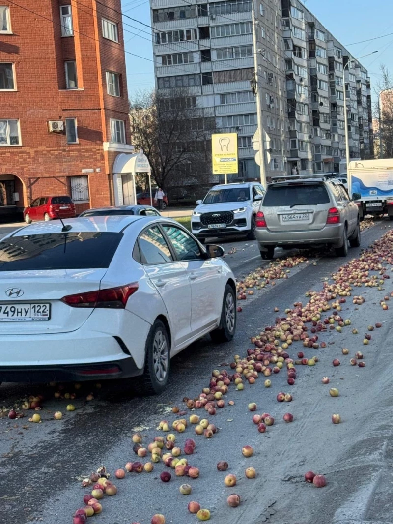 Причем на проезжей части лежат даже не испорченные, а наоборот, спелые, румяные, наливные яблочки. Вероятно, они выпали из неизвестного фургона.