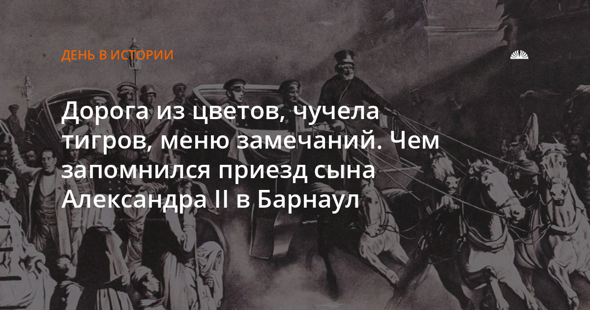 - В 1868 году неподалеку от Барнаула огромная толпа с криками «ура» встречала кортеж третьего сына императора Александра II — Владимира Романова. Он отправился в ознакомительное путешествие по России и заглянул в город. К приезду царской особы барнаульцы устроили на Соборной площади зеленую арку, а путь кортежа усыпали цветами.
