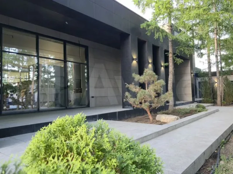 Территория вокруг дома продумана для максимального комфорта. Здесь есть гостевой дом с баней, просторный гараж для коллекции автомобилей и ландшафтный парк с вековыми пихтами. Вечерняя подсветка превращает парк в сказочное пространство.