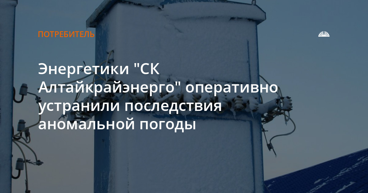 В связи со штормовым характером погоды отключения произошли в 18 населенных пунктах региона (г. Горняк, г. Рубцовск, г. Змеиногорск, г. Камен-на-Оби, с.Третьяково, с.Староалейское, с.Колывань, с.Завьялово, с.Новоегорьевка, с.Шелаболиха, с.Панкрушиха, с.Благовещенка, с.Белоярск, с.Боровлянка, с.Уткино, с.Червянка, с.Листвянка, с.Шипуново). Энергетики всего края, устраняя последствия стихии, работают в режиме повышенной готовности.