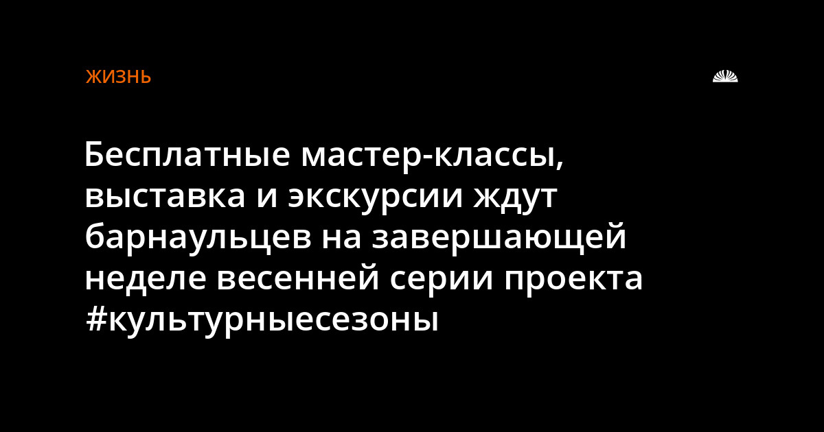 Неделя с 11 по 17 июня станет завершающим этапом весенней серии проекта #культурныесезоны. В это время организаторы проекта готовят для барнаульцев бесплатные мастер-классы по рисованию, лекции по культуре речи , выставку и экскурсии.