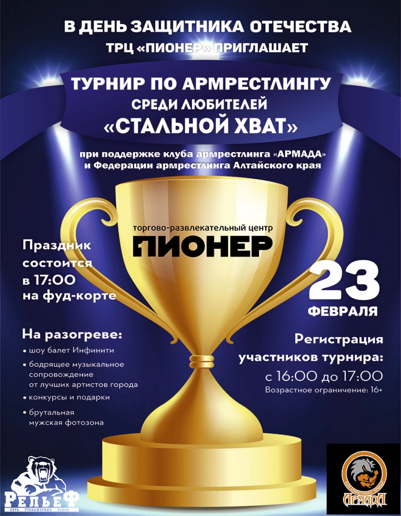 При поддержке Федерации по армреслингу Алтайского края, спортивного клуба Армада и сети тренажерных залов Рельеф состоится турнир по армреслингу среди любителей! Любой желающий от 16 лет может стать участником соревнований.