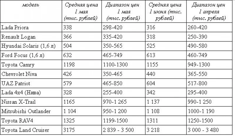 Для мониторинга цен auto.altapress.ru выбрал дюжину наиболее популярных моделей в разных ценовых сегментах. 1 мая на основе опубликованных на сайте drom.ru объявлений мы посчитали среднюю стоимость предложений по этим моделям и записали диапазон цен. Месяц спустя, 1 июня, auto.altapress.ru повторил эту процедуру. Подчеркнем: мы смотрели только объявления о продаже машин, выпущенных в 2013 году — именно "трехлетки" чаще всего становятся объектами перепродажи.