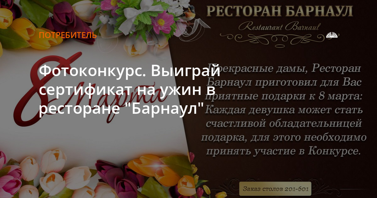 Сайт altapress.ru и ресторан "Барнаул" объявляют конкурс на лучшую фотографию девушки в интерьере ресторана "Барнаул" Для того чтобы стать участником конкурса вам необходимо с 15 февраля по 1 марта включительно присылать на электронный адрес: tad@altapress.ru фотографии.