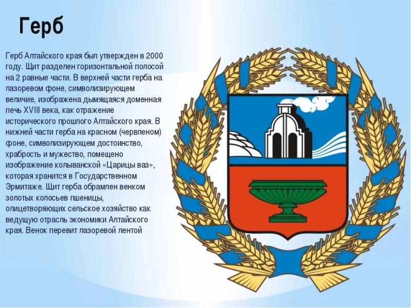 Напомним, сейчас на гербе Алтайского края изображены дымящаяся доменная печь XVIII века и колыванская "Царица ваз".