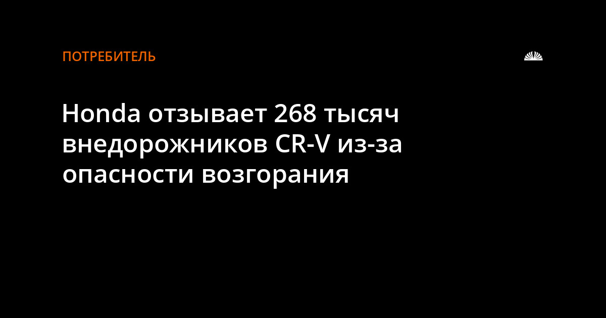 Японский автоконцерн Honda отзывает 268 тысяч внедорожников CR-V 2002-2006 модельных годов. Причиной отзыва стала необходимость в замене электрического дверного замка в двери со стороны водителя, передаёт РБК со ссылкой на зарубежные СМИ. Из-за производственного дефекта дождевая вода может попасть на электровыключатель, что, в свою очередь, может привести к короткому замыканию и возгоранию. На данный момент известно о 4 случаях подобного самовозгорания, в результате которых никто не пострадал.