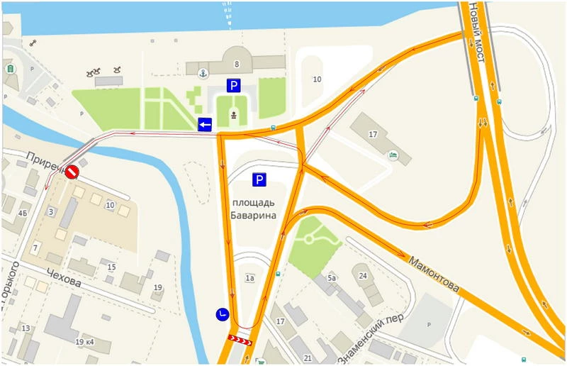 По временной схеме движения заезд на пл. Баварина будет осуществляться со съездов с Нового моста, выезд с пл. Баварина будет организован на улицы Мамонтова и Максима Горького.