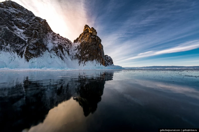 "Покрытый льдом Байкал называют самым большим катком в мире. Зимой это огромное озеро, по площади сравнимое с Бельгией, замерзает целиком — кроме того небольшого участка, где из него вытекает река Ангара. Лед на Байкале настолько прочный, что по нему спокойно ездят внедорожники, а в 1904 году даже ходил поезд по специально проложенной зимней железной дороге", — делится любопытными фактами фотограф.
