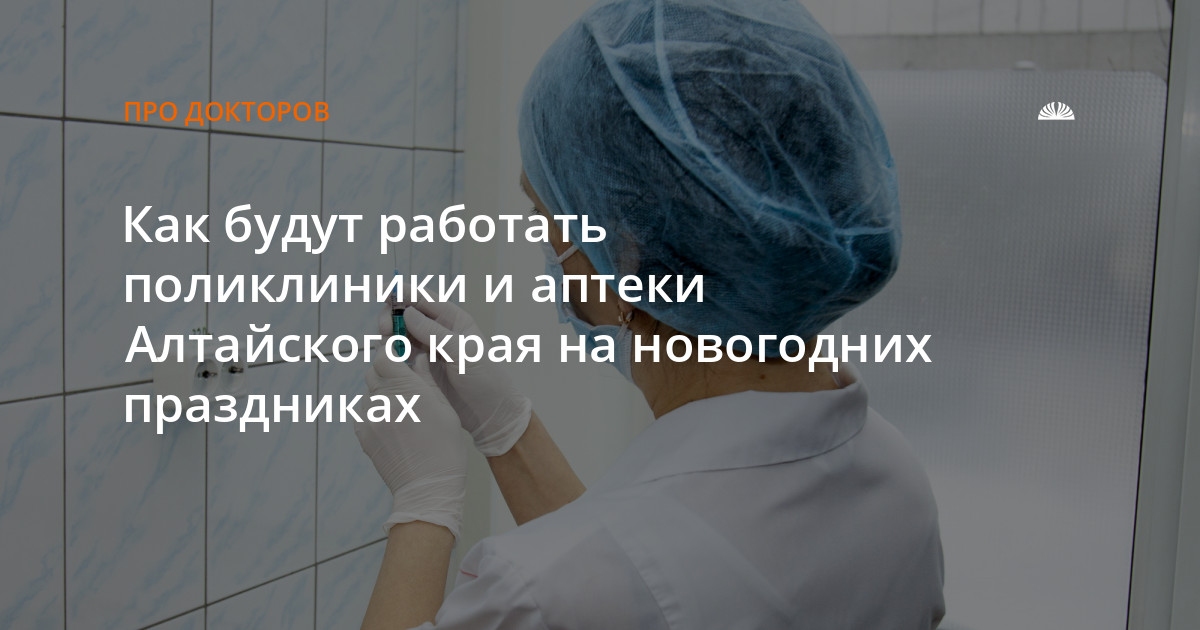 В праздники в Барнауле и районах края будут работать филиалы «Аптек Алтая». График такой же, что и у поликлиник. Исключение — пункт на пр. Ленина, 87 в Барнауле, он будет открыт еще 1 января, с 10:00 до 20:00.