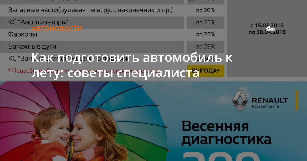 По словам эксперта, подготовку машины к лету можно провести самостоятельно. Но лучше всего доверить этот процесс профессионалам. Тем более, что владельцам автомобилей Renault повезло: зарегистрированные на сайте My Renаult пользователи смогут до конца апреля провести весеннюю диагностику всего за 299 рублей (без акции и для всех остальных автомобилистов, в том числе владельцев авто других марок, такая процедура стоит 1350 рублей).