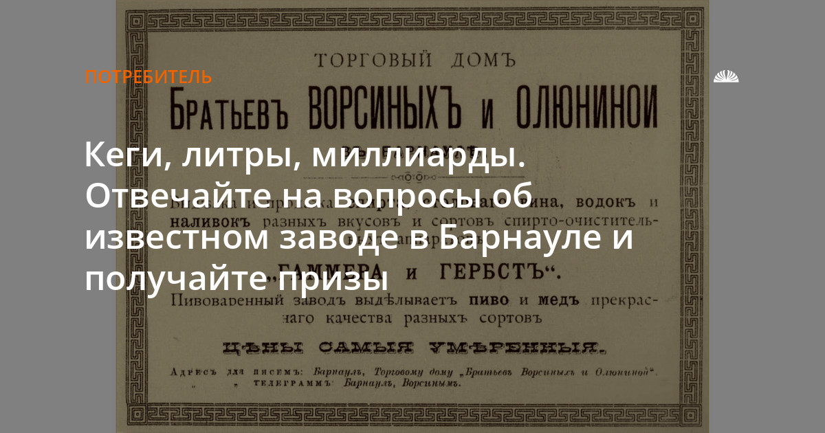 2023 год — примечательный для Алтайского края — 140 лет исполняется с того момента, как появился первый пивоваренный завод Ворсиных, и 45 лет как был построен Барнаульский пивоваренный завод, который продолжил славные традиции известных в прошлом купцов. Отвечайте на вопросы об этих предприятиях и получайте призы. Трем победителям мы вручим по упаковке напитков «Колы», Good stripes и пива «Вобла безалкогольная».