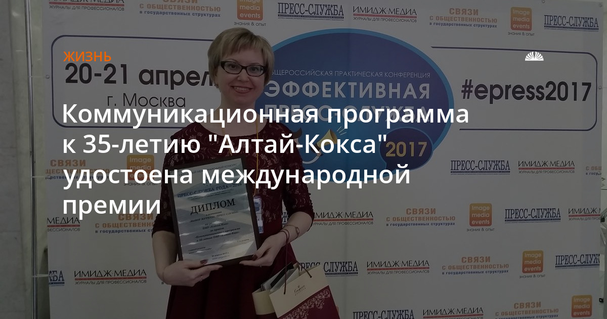 Оргкомитет конкурса отметил дипломом коммуникационную программу к 35-летию "Алтай-Кокса". Она включала ряд юбилейных пиар-проектов: корпоративные фильмы, мультимедийные презентации, творческие конкурсы для школьников, ветеранов, рабочих и их семей, а также выпуск полиграфии, сувениров и баннеров с юбилейной символикой.