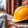 Строительная каска на кирпичной стене.