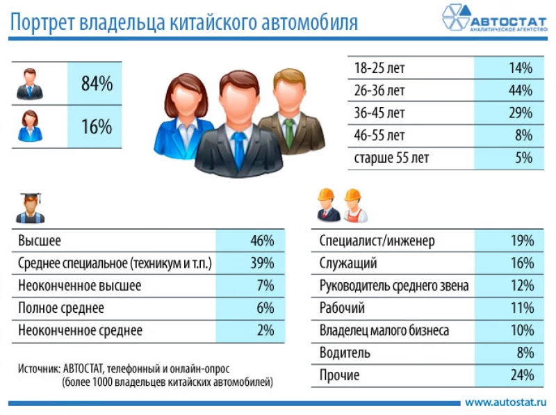 Аналитики подсчитали соотношение мужчин и женщин среди покупателей автомобилей китайского производства. Также они выяснили их возраст, образование и род деятельности. Данные представлены в виде инфографики: