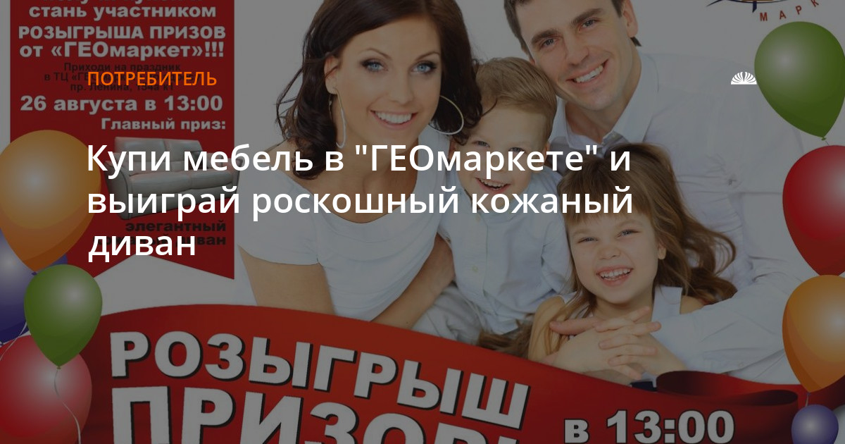 Поучаствовать в розыгрыше может каждый. Для этого достаточно до 25 августа купить в любом из отделов "ГЕОмаркета" товар на сумму от 1 тыс. рублей и получить купон и анкету. Заполненные анкеты нужно будет сбросить в специальный ящик. Он находится на первом этаже у входа.