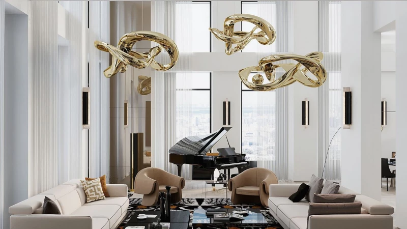 Свободная планировка огромного пространства пентхаусов позволяет владельцу конструировать жилое пространство в соответствии с собственными вкусовыми предпочтениями. В пентхаус можно интегрировать кухню, столовую, гостиную, библиотеку и кабинет, а также камерный концертный зал. Для демонстрации потенциала этих грандиозных объектов дизайнеры застройщика визуализировали интерьер, который мог бы здесь появиться.