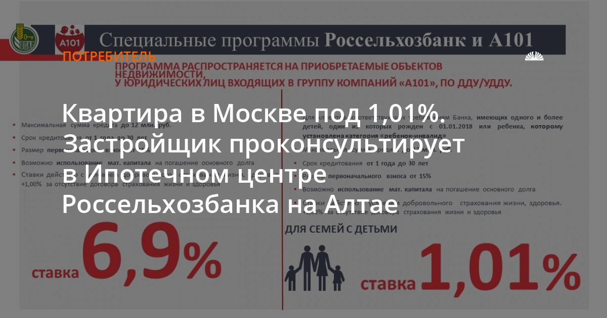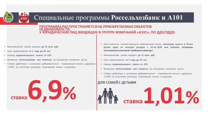 «Благодаря взаимодействию с нашим партнером ГК «А101» мы можем предложить клиентам привлекательные условия по ипотечному кредитованию на фоне повышения ставок по кредитам. По программе «Семейная ипотека» ставка для клиентов получилась даже ниже средней ипотечной ставки в западноевропейских странах. Посмотреть варианты квартир можно не выходя из дома – на сайте нашего партнера или обратившись в ипотечный центр Россельхозбанка на Алтае в офисе на проспекте Ленина 80Б», - рассказала Татьяна Руденко, заместитель директора Алтайского филиала Россельхозбанка.