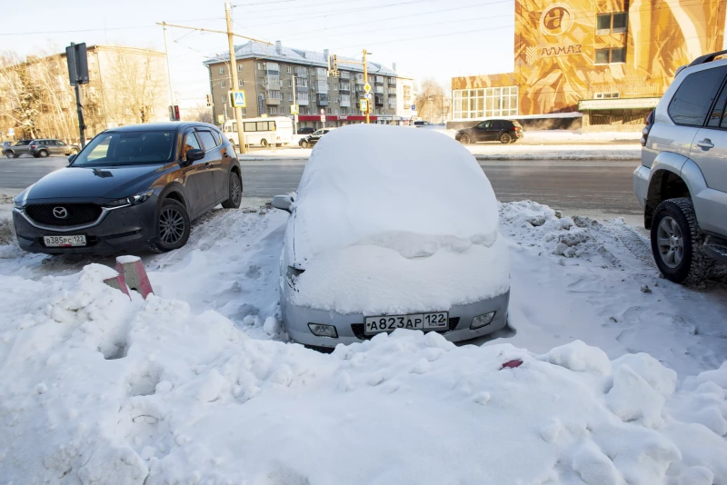 Снежные завалы на тротуарах и парковках в Барнауле, январь 2026.