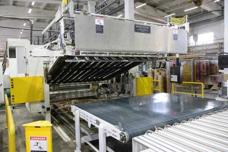 На входе линия принимает заготовки из гофрокартона, а на выходе мы получаем уже скрепленную стреп-лентой кипу с указанным в заявке количеством гофрокоробок. Такая линия требует минимального ручного труда – это встреча укладчиком-упаковщиком готовой кипы на выходе и ее подготовка к транспортировке.