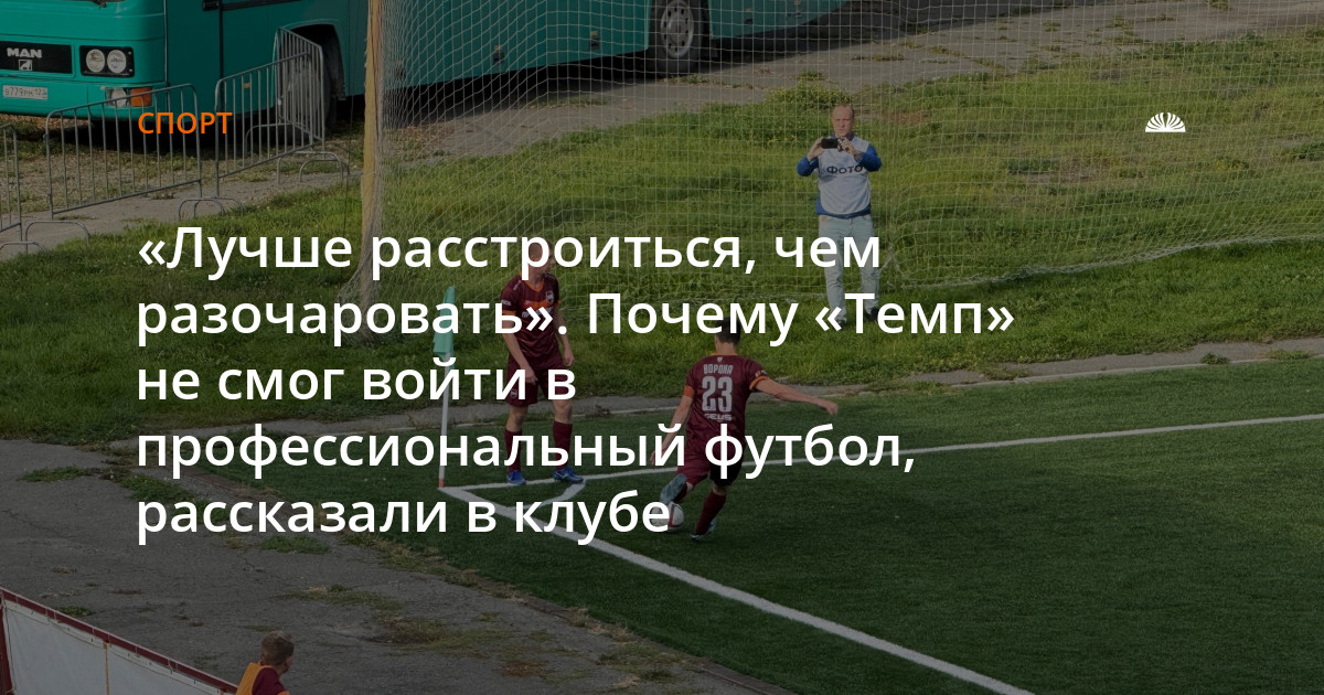 Путь «Темпа» в профессиональный футбол – Вторую лигу «Б» – оборвался почти на финишной прямой. В клубе договорились с игроками о контрактах, решили вопросы с игровым полем, адаптировав газон и трибуны школы Смертина под требования профессионального чемпионата. Но не смогли привлечь дополнительные средства, необходимые для повышения в классе.