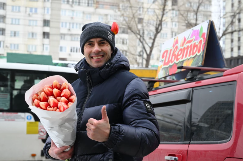 Барнаулец с цветами в преддверии 8 марта в Барнауле.