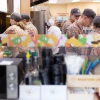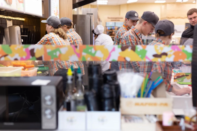 Как в торговом зале, так и в кафетерии покупателей встречают позитивные молодые ребята в стильных фартуках и ярких рубашках. Они умело готовят кофе и хот-доги, раскладывают свежие овощи и фрукты, быстро обслуживают покупателей на кассах. Ведь кроме классической профессии кассира-продавца, в команде экспериментального магазина появились кассиры-бариста, кондитеры, пекари.