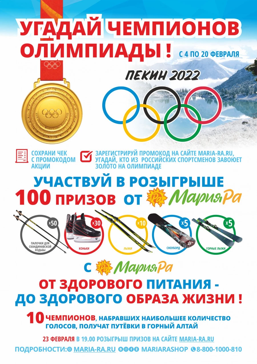 23 февраля среди тех покупателей, чьи голоса были отданы за спортсменов-обладателей олимпийского золота, «Мария-Ра» разыграет 100 спортивных призов: 5 комплектов горных лыж, 5 комплектов для сноуборда, 10 пар лыж, 30 пар коньков и 50 пар палочек для скандинавской ходьбы. Все призы будут подобраны с учетом индивидуальных размеров и доставлены лично в руки удачливым сибирякам, чтобы они могли еще в этом сезоне заняться спортом, как и победители зимних Олимпийских игр-2022.