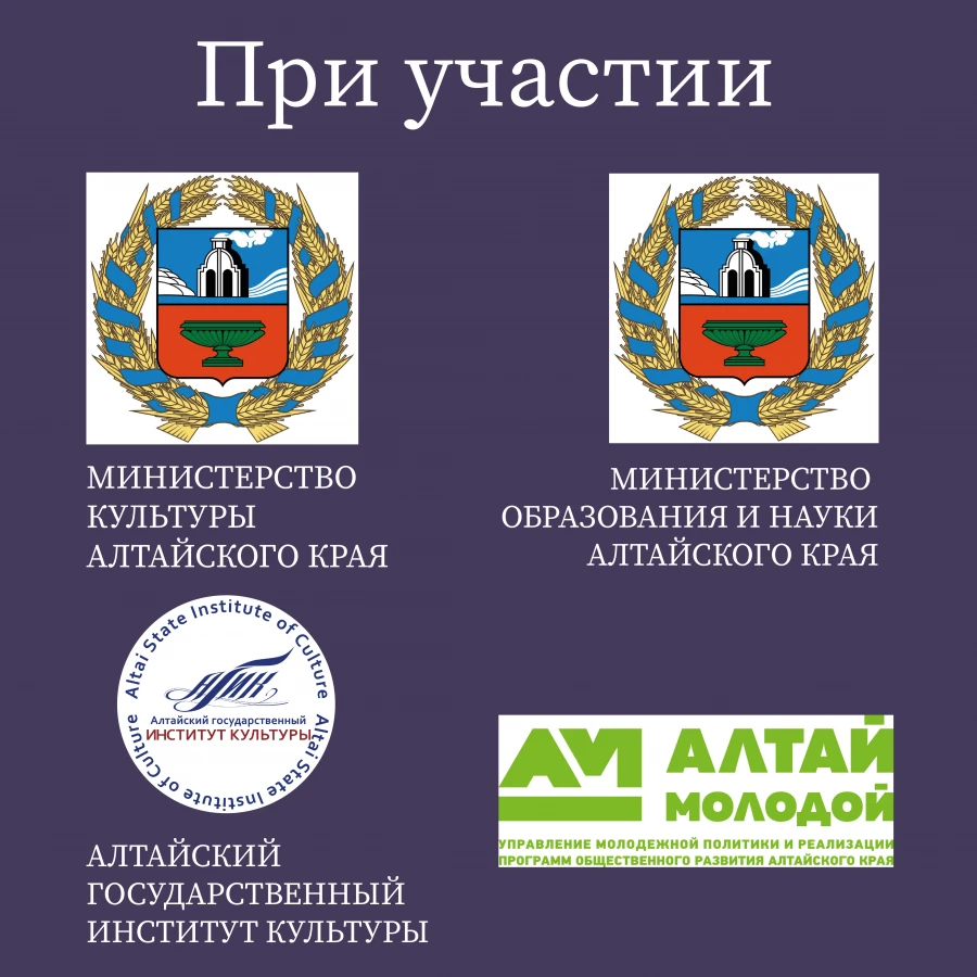 Соорганизаторами конкурса являются: Министерство культуры Алтайского края, Министерство образования и науки Алтайского края, Управление молодежной политики и реализации программ общественного развития Алтайского края.